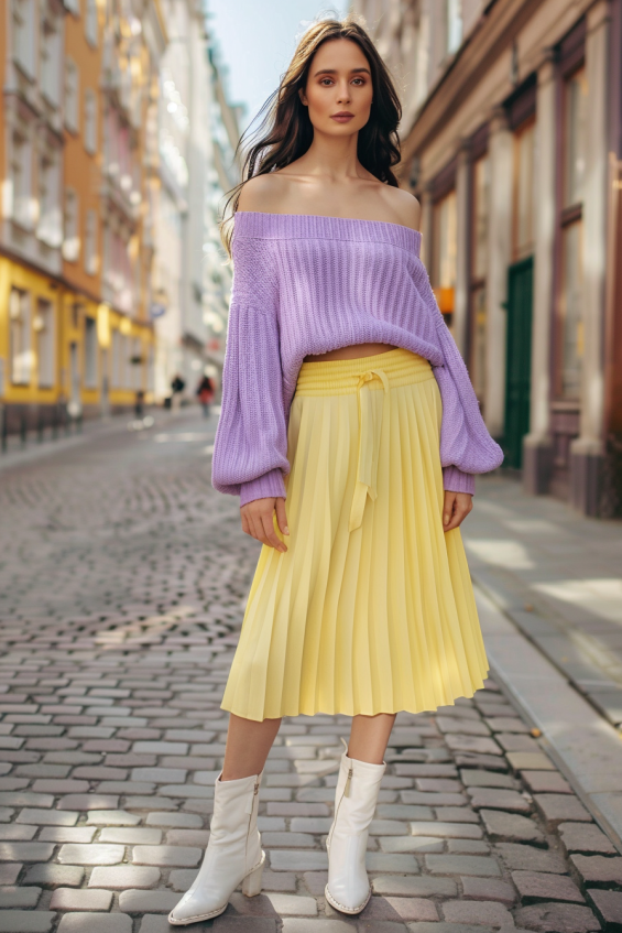 This outfit is the perfect blend of cozy and feminine. A soft lilac off-shoulder sweater brings a relaxed elegance, while the pleated yellow midi skirt adds a fresh and playful contrast. The slightly oversized knit keeps things comfy, while the flowy skirt adds movement and charm. Finished with sleek white ankle boots, this look is effortlessly stylish with a modern touch.