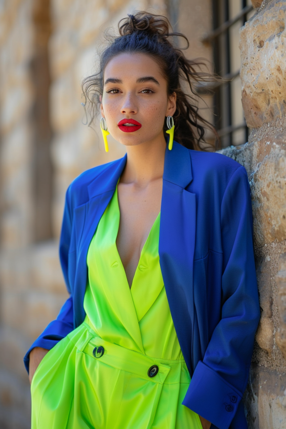 This outfit is pure fashion-forward energy. A structured neon green jumpsuit makes an electrifying statement, while the oversized royal blue blazer adds a polished contrast. The deep V-neckline keeps things sultry, and the cinched waist creates a striking silhouette. Playful lightning bolt earrings and a bold red lip take this look from daring to unforgettable.