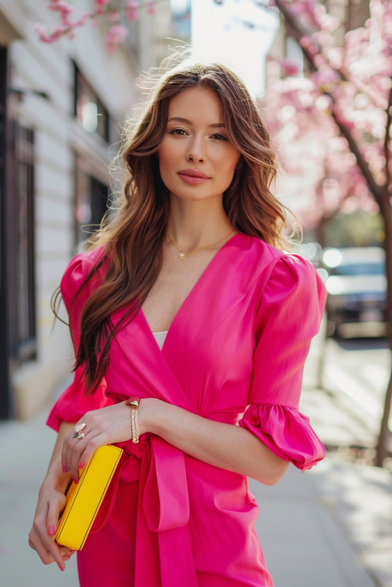A bold pink wrap dress like this is the definition of springtime elegance. The puffed sleeves add a romantic touch, while the cinched waist and bow detail create a flattering, feminine silhouette. Paired with a bright yellow clutch, this outfit embraces fun color-blocking that feels fresh and modern. Delicate gold jewelry ties everything together with a hint of sophistication.