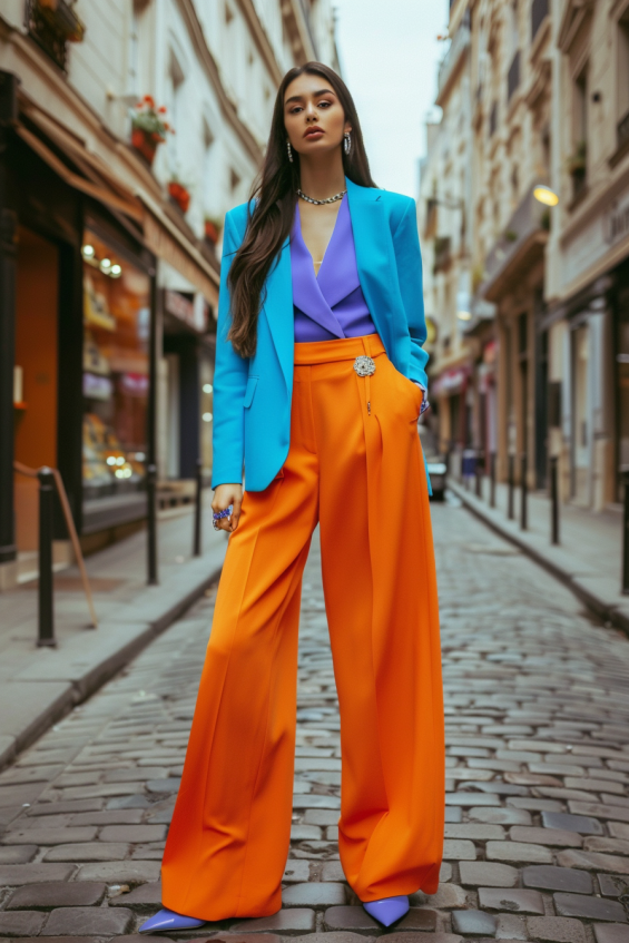 This outfit is all about fearless color play. A bright blue blazer pairs effortlessly with a lavender blouse, creating a cool-toned contrast against the fiery orange wide-leg trousers. The statement belt detail adds just the right amount of glam, while the pointed-toe heels in matching lavender bring everything together seamlessly. This look is proof that mixing bold hues can be both sophisticated and fun.