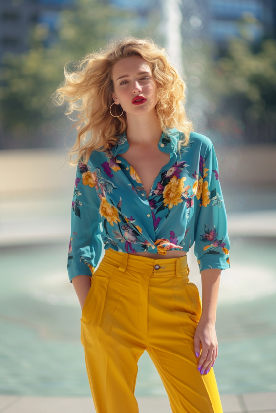 This look is springtime perfection. A breezy teal floral blouse with bold yellow flowers sets the tone for a fresh, vibrant vibe. Tucked effortlessly into structured high-waisted yellow trousers, this outfit balances relaxed femininity with sharp tailoring. Rolled-up sleeves and a slightly undone neckline add a laid-back charm, making it perfect for sunny days.