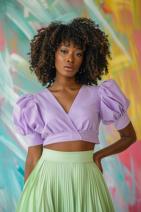 This outfit is pastel perfection. A dreamy lavender crop top with dramatic puff sleeves brings a playful yet elegant touch, while the mint-green pleated skirt adds movement and a fresh springtime feel. The fitted waist balances the volume on top, creating a flattering silhouette that’s both stylish and fun.