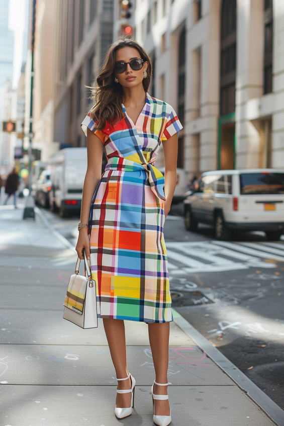 This outfit is the definition of bold and classy. A structured wrap dress in a vibrant multicolored plaid brings a fresh, contemporary twist to a classic silhouette. The cinched waist and midi length create an effortlessly polished look, while the crisp short sleeves add a casual, breezy touch. Paired with white strappy heels and a matching handbag, this look blends playful energy with urban sophistication.