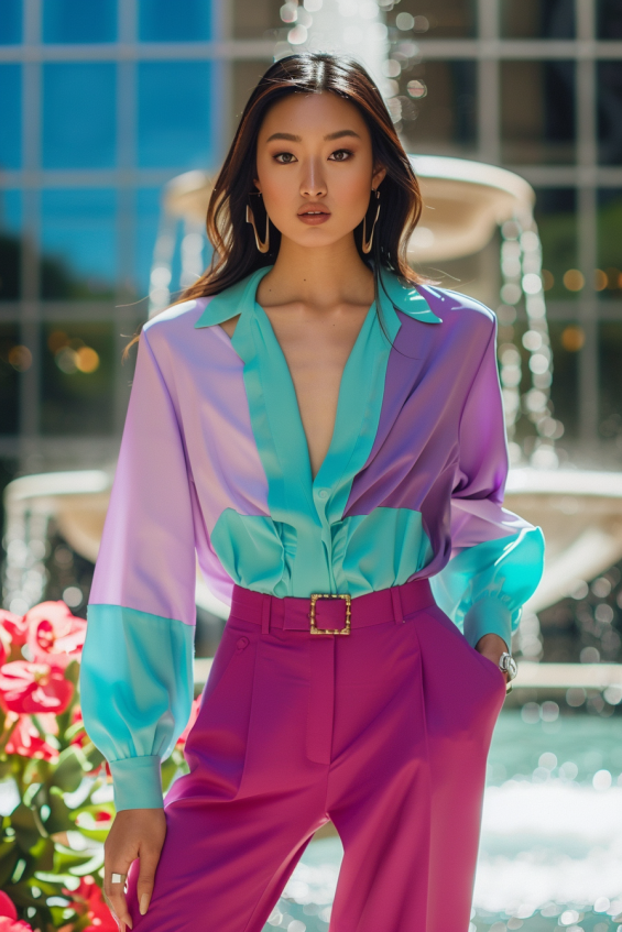 This outfit is a dreamy mix of sophistication and bold color play. The silky ombre blouse fades between soft lavender and aqua, creating a mesmerizing effect. Paired with tailored high-waisted pink trousers and a statement belt, this look balances elegance with a fashion-forward edge. Flowing sleeves and a deep neckline add a touch of drama, making this an effortlessly chic choice.