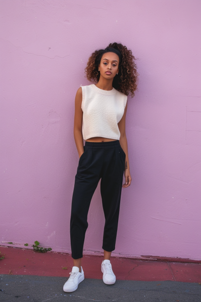 This outfit strikes the perfect balance between relaxed and stylish. The sleeveless cream knit crop top adds texture and a laid-back vibe, while the high-waisted, tapered black pants offer a flattering, structured silhouette. White sneakers tie it all together, giving it a casual edge perfect for a fun arcade date.