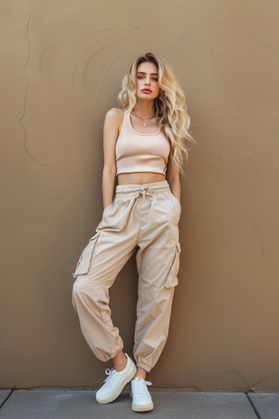 This outfit is all about relaxed monochrome perfection. The ribbed beige crop top offers a sleek, fitted silhouette, while the loose, drawstring cargo pants keep things casual and comfy. White sneakers round off the look, keeping the neutral tones fresh and effortlessly stylish.
