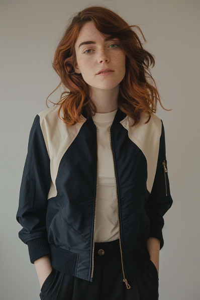 This outfit exudes understated cool with a sleek black-and-white two-tone bomber jacket layered over a crisp white tee. The structured jacket adds a sporty, modern touch, while the simple pairing of black trousers keeps the look polished yet casual. It’s the perfect balance of monochrome chic and arcade-ready comfort.