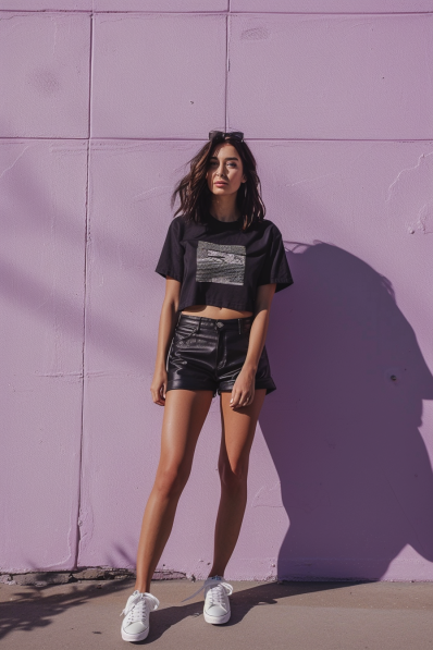 This outfit serves serious attitude with a trendy graphic crop top paired with sleek black leather shorts. The shorts’ high-waist design creates a leg-lengthening effect, while the white sneakers keep the vibe playful and laid-back. Topping it off with black sunglasses gives just the right hint of cool-girl confidence.