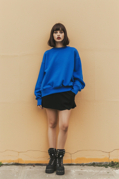 This bold and edgy look features an oversized electric blue sweater that’s all about comfort and drama. Paired with a sleek black mini skirt, it creates a striking contrast between cozy and flirty. Chunky black boots with metal details add a rebellious touch, giving the outfit serious attitude.