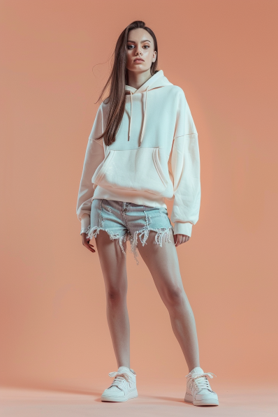 Oversized Hoodie With Distressed Denim Shorts and Sneakers