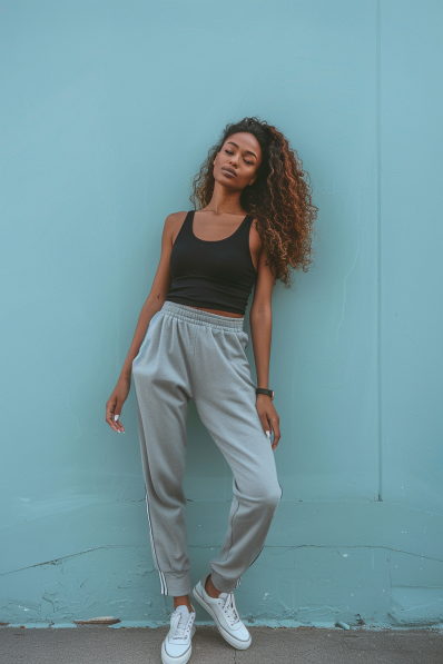 This outfit is all about comfort with a sporty edge. The fitted black tank top creates a sleek silhouette, while the loose-fitting grey joggers keep things casual and comfy. White sneakers add a clean finish, making it perfect for an active, fun arcade date.