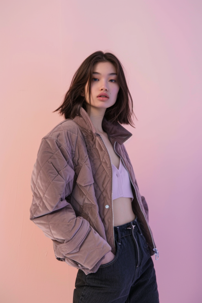 This outfit offers a mix of soft and edgy elements. The oversized quilted mauve jacket brings warmth and texture, while the light lavender crop top adds a subtle, feminine touch. Dark-wash high-waisted jeans ground the look, balancing out the pastels with a bold contrast.