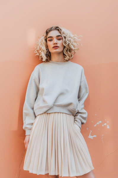 I’m loving how this outfit feels stylish but super easy-going. The pleated skirt adds just the right amount of polish, while the sweatshirt keeps things casual and comfortable. It’s great for when you want to look cute but still feel totally at ease. Stylish, simple, and oh-so-comfy!
