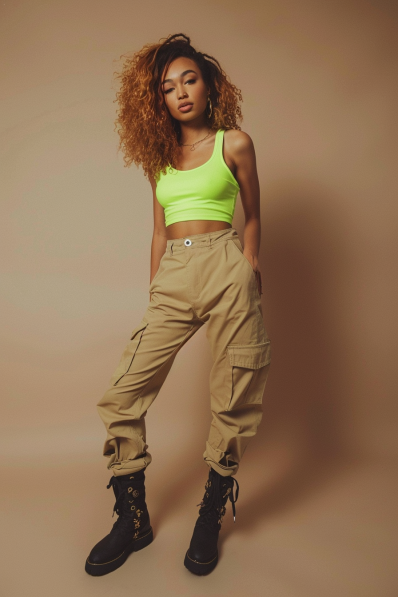 This look makes a statement with a neon green cropped tank top, beige high-waisted cargo pants, and chunky black combat boots. The bright tank brings that pop of color to grab attention, while the cargo pants keep things practical with roomy pockets. The combat boots round it all out with a bold, street-style edge.