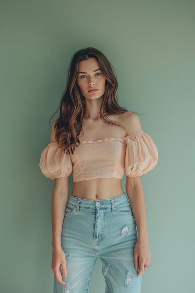 This outfit is all about soft elegance with a touch of fun. The peachy off-shoulder crop top features dreamy puff sleeves that add a playful yet feminine vibe. Paired with high-waisted, light wash distressed jeans, it strikes a balance between sweet and casual—perfect for a relaxed arcade date.