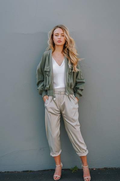 This look blends sporty and chic elements beautifully. The olive-green bomber jacket adds a cool, street-style vibe, while the satin joggers bring a touch of luxury with their soft sheen. A white V-neck top underneath keeps it simple and fresh, and the strappy heeled sandals elevate the entire outfit for a polished finish.