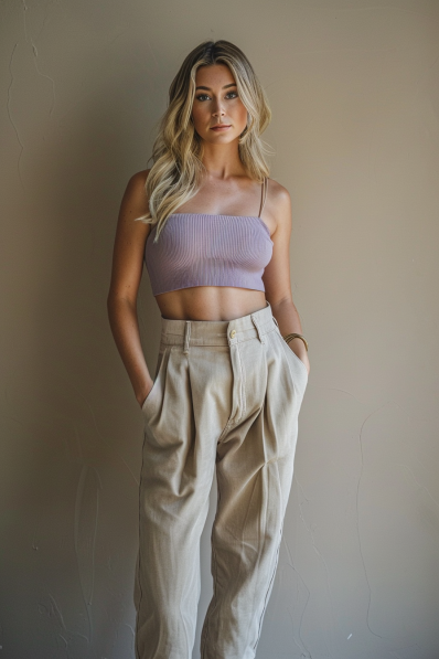 Soft Minimalism With a Lavender Crop Top and Neutral Trousers