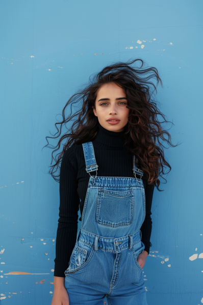 This playful yet stylish outfit pairs classic denim overalls with a fitted black turtleneck. The dark top contrasts beautifully with the vibrant blue denim, creating a polished yet casual aesthetic. The overalls bring a nostalgic, retro charm, while the turtleneck adds sophistication and warmth.