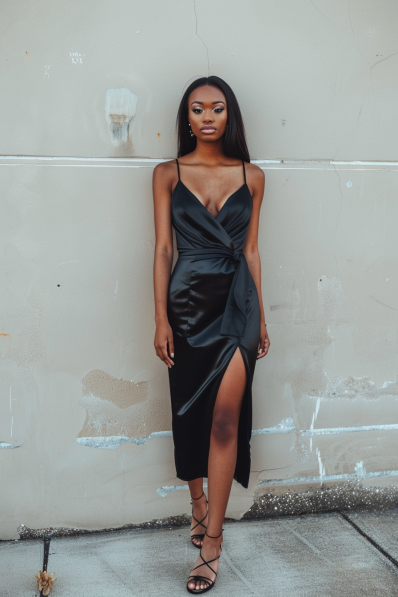 A black satin slip dress like this one is the definition of effortless elegance. The silky fabric drapes beautifully, hugging the body in all the right places while the wrap-style waist adds a flattering touch. The thin spaghetti straps and deep V-neckline create a refined yet sultry look, and that thigh-high slit? Just the right amount of drama to keep things interesting. Paired with minimalist strappy heels, the whole vibe is chic and timeless.
