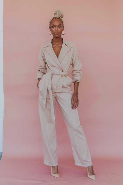 This neutral-toned belted jumpsuit is the perfect blend of comfort and sophistication. The structured lapel and cinched waist create a flattering shape, while the relaxed fit keeps things effortlessly chic. The lightweight fabric drapes beautifully, making it ideal for an elegant dinner look that’s both stylish and practical. Paired with nude heels and statement earrings, the outfit feels refined and modern without being fussy.