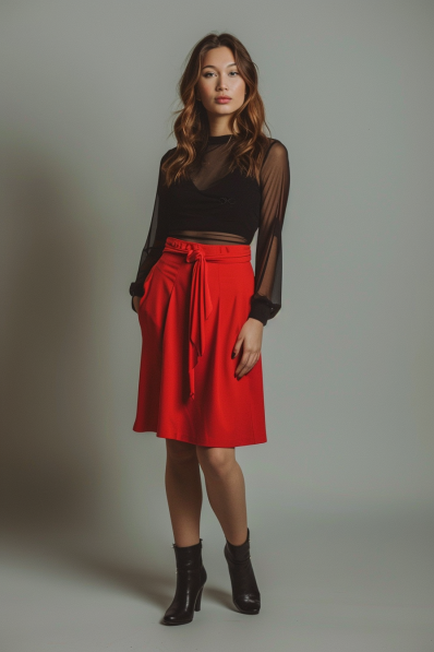 This outfit brings together a striking mix of elegance and boldness. The sheer black long-sleeve top adds a touch of mystery and sophistication, while the high-waisted red midi skirt brings a fun pop of color with its flattering tie-waist detail. The flowy skirt falls beautifully, creating a feminine silhouette, and the black ankle boots give the whole look an edgy yet polished finish.