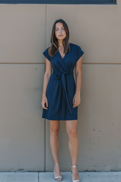 This navy blue tie-waist dress is the perfect example of effortless elegance. The soft fabric drapes beautifully, creating a relaxed yet polished look, while the cinched waist with a self-tie belt adds a flattering touch. The V-neckline and cap sleeves keep it simple and chic, making it a great choice for a classy dinner night. Paired with sleek silver heels, the outfit feels refined and timeless.