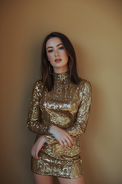 This gold sequin mini dress is the ultimate statement piece for a classy dinner night with a touch of glam. The high neckline and long sleeves balance out the short hemline, creating a sophisticated yet bold silhouette. The shimmering sequins catch the light beautifully, making sure all eyes are on you without even trying. Paired with minimal accessories and sleek heels, this look is all about confidence and sparkle.