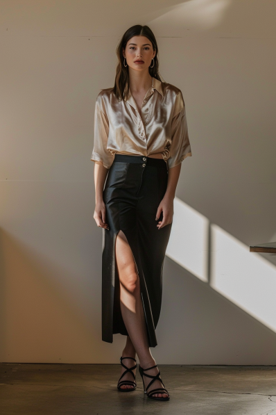This satin blouse and leather skirt combo strikes the perfect balance between elegance and edge. The silky champagne-toned blouse drapes effortlessly, adding a soft and luxurious touch, while the high-waisted black leather skirt brings a bold contrast with its sleek design and daring thigh-high slit. The strappy black heels tie everything together, creating a polished yet sultry outfit that’s perfect for a classy dinner night.