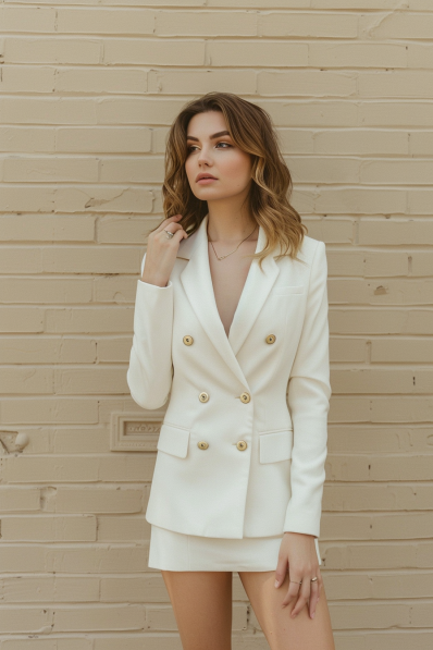 This crisp white blazer and mini skirt combo is the perfect balance of sophistication and modern style. The tailored double-breasted blazer, with its gold button details, gives off major power-dressing vibes, while the fitted mini skirt adds a touch of femininity. The clean lines and structured fit make this outfit effortlessly chic, ideal for a dinner date where you want to look polished but not overdone. Pairing it with delicate jewelry keeps the look refined and stylish.