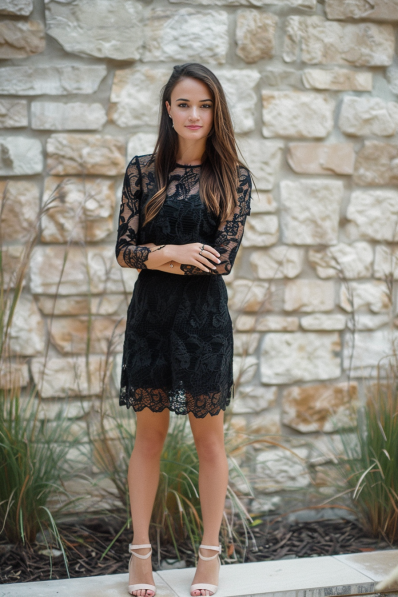This black lace dress is the definition of timeless elegance. The delicate lace detailing gives it a soft, romantic feel, while the sheer long sleeves add just the right amount of intrigue. With its flattering A-line cut and scalloped hem, this dress strikes the perfect balance between sophisticated and flirty. Paired with nude strappy heels, the entire look feels effortless yet put-together.