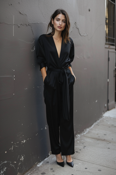 This black jumpsuit is the perfect blend of sophistication and effortless cool. The deep V-neckline adds a hint of allure, while the cinched waist with a tie detail creates a flattering shape. The slightly relaxed fit keeps things comfortable without losing that polished vibe. Paired with classic black pointed-toe heels, this look is a minimalist dream that’s perfect for a classy dinner night.