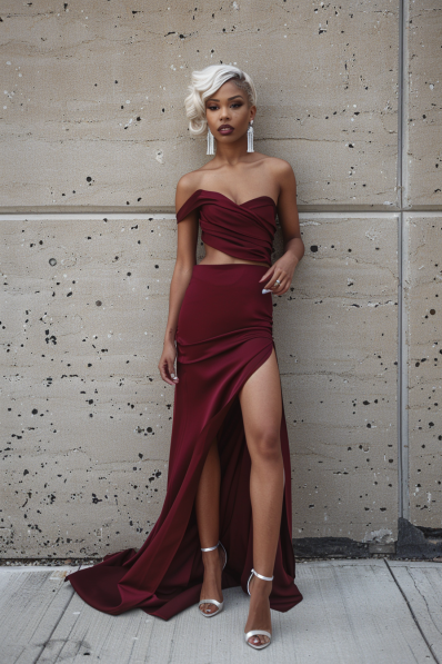 A look like this feels so empowering and stylish. The rich burgundy color brings a sense of sophistication, while the off-shoulder design adds a hint of modern flair. It’s the perfect mix of sultry and elegant, making it ideal for a night out when you want to turn heads but still keep things classy. Plus, the two-piece style gives it a fresh, fashion-forward edge that’s hard to resist.