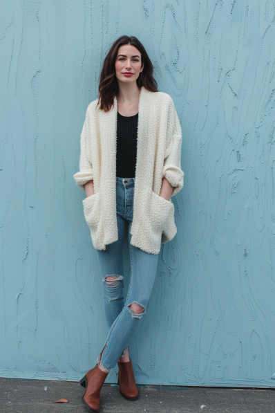 This outfit pairs a soft, oversized cream cardigan with a classic black top and distressed skinny jeans. The cardigan’s chunky texture adds a cozy touch, while the fitted jeans bring balance to the relaxed silhouette. Brown ankle boots complete the look, adding a subtle contrast that ties everything together effortlessly.