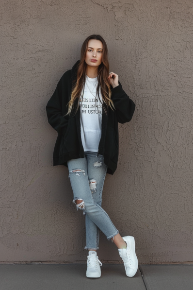 This look features an oversized black cardigan layered over a graphic white tee and distressed skinny jeans. The relaxed fit of the cardigan adds an effortlessly cool touch, while the ripped jeans bring in a bit of edgy flair. Crisp white sneakers complete the outfit, giving it a clean, modern feel that’s perfect for casual outings.