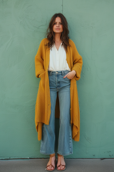 This outfit combines a flowy mustard longline cardigan with a crisp white blouse and high-waisted wide-leg jeans. The cardigan’s relaxed fit drapes beautifully, adding a touch of warmth and dimension, while the vintage-inspired denim gives the look a laid-back, boho vibe. Simple sandals complete the outfit, making it perfect for an easygoing day.