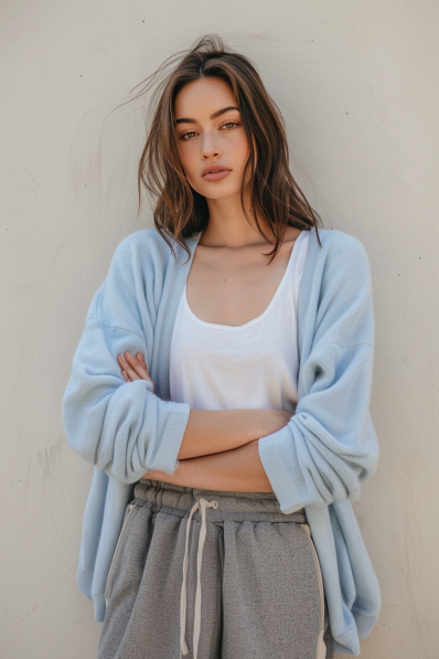 This outfit pairs a soft baby blue cardigan with a classic white tank top and relaxed gray sweatpants. The cardigan’s airy fabric and relaxed fit add a cozy touch, while the neutral tones of the outfit keep things effortlessly stylish. The drawstring waist on the pants adds a sporty vibe that balances the overall softness.