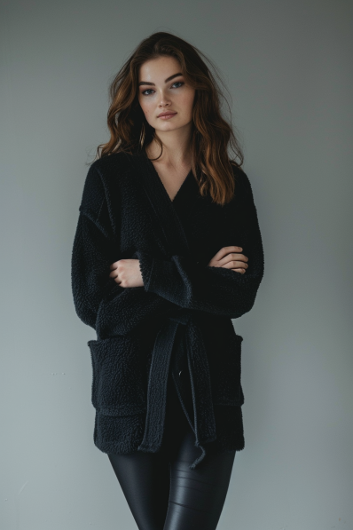 This outfit features a plush black belted cardigan paired with sleek black leather leggings, creating a stylish monochrome look. The cardigan’s soft texture contrasts beautifully with the edgy shine of the leggings, while the tie-waist detail adds structure and a flattering silhouette. Minimal accessories let the outfit’s chic simplicity take center stage.
