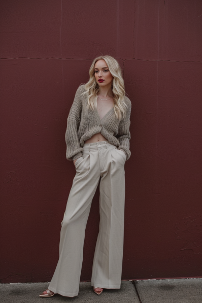 This outfit blends a cozy cropped knit cardigan in a soft taupe shade with high-waisted wide-leg trousers in a complementary cream tone. The slightly oversized fit of the cardigan creates a relaxed yet polished vibe, while the tailored pants bring structure and elegance. Strappy heels add a subtle touch of sophistication, making the whole look effortlessly chic.