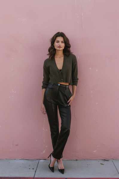 This outfit features a deep olive cropped cardigan paired with high-waisted black leather pants for a chic, modern look. The ribbed texture of the cardigan adds a touch of softness, while the sleek leather bottoms create a bold, edgy vibe. Classic black heels complete the outfit, giving it a polished and confident finish.