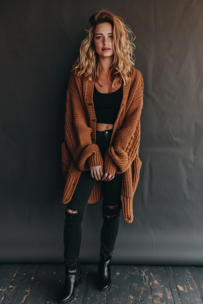 This outfit pairs an oversized chunky-knit cardigan in a warm caramel hue with a black crop top and distressed skinny jeans. The rich, earthy tone of the cardigan adds a cozy feel, while the fitted black pieces underneath create a flattering contrast. Black ankle boots complete the look, adding just the right amount of edge.