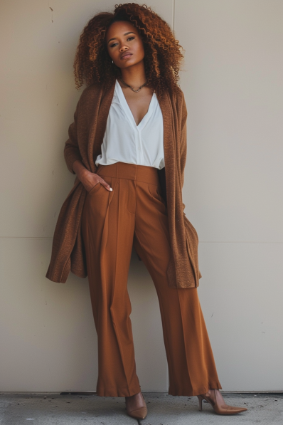 This look combines a rich brown cardigan with high-waisted wide-leg trousers in a matching earthy tone. A crisp white blouse tucked neatly adds a touch of sophistication, while nude heels elevate the entire ensemble. The cardigan drapes effortlessly, creating a balanced mix of relaxed and polished elements.