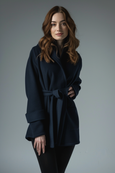 This outfit features a structured navy belted cardigan paired with sleek black leggings for a polished yet effortless look. The wrap-style cardigan cinches at the waist, creating a flattering silhouette, while the deep navy color adds a touch of understated elegance. The clean lines and minimal details keep the whole ensemble feeling refined and chic.