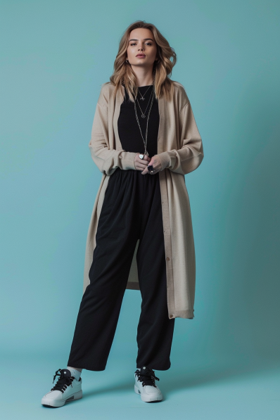 This outfit features a long beige cardigan layered over an all-black ensemble of a fitted top and flowy trousers. The relaxed fit of the cardigan adds a touch of effortless style, while the monochrome base keeps things sleek and modern. White sneakers and layered jewelry bring a sporty yet polished vibe to the whole look.