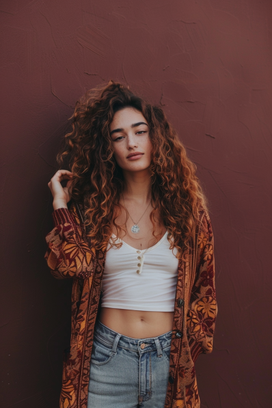 This outfit features a beautifully patterned cardigan in warm autumnal tones paired with a simple white crop top and high-waisted jeans. The intricate design of the cardigan adds a vintage-inspired touch, while the crop top and denim keep the look fresh and modern. A delicate pendant necklace completes the ensemble, adding a hint of effortless boho charm.
