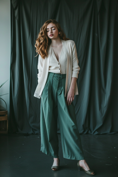 This outfit features a lightweight cream cardigan paired with a matching knit top and high-waisted wide-leg trousers in a muted sage green. The cardigan’s open design adds a relaxed touch, while the tailored trousers bring structure and sophistication. Neutral-toned heels complete the look, making it effortlessly chic and polished.