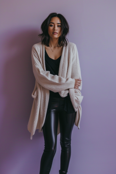 This outfit blends a relaxed beige cardigan with sleek black leather leggings and a simple black top. The soft knit drapes effortlessly, bringing a cozy touch that contrasts perfectly with the edgy vibe of the leggings. The neutral tones keep things chic, while the textures add interest without feeling overdone.