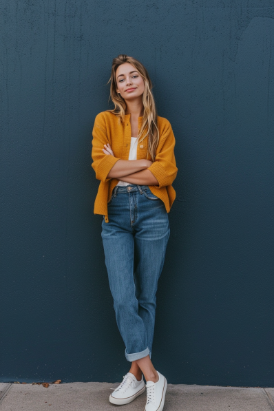 This look features a vibrant mustard cardigan paired with a classic white tank top and high-waisted, relaxed-fit jeans. The rolled-up cuffs and white sneakers keep things effortlessly casual, while the cropped cardigan adds a fun, stylish touch without being too fussy. The color choice brings warmth and personality to an otherwise simple outfit.