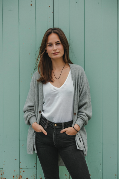 There’s something so classic and versatile about this combination. The neutral colors make it a go-to option for any casual outing, and the cardigan adds that perfect touch of warmth without feeling bulky. It’s an ideal outfit for those days when you want to look put-together without putting in too much effort.