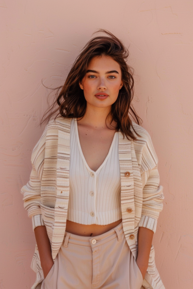 This outfit blends soft neutral shades with a striped oversized cardigan layered over a ribbed crop top and relaxed-fit trousers. The earthy palette creates a fresh and effortless vibe, while the lightweight fabrics add to the relaxed feel. The cardigan’s subtle pattern brings just the right amount of detail without overpowering the outfit.