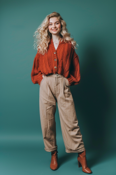 This look features a chunky rust-colored cardigan styled with high-waisted beige trousers and matching ankle boots. The warm tones of the outfit create a beautiful autumn-inspired palette, while the relaxed fit of the trousers adds a touch of effortless charm. The textured knit and button details give the cardigan a cozy yet polished look.